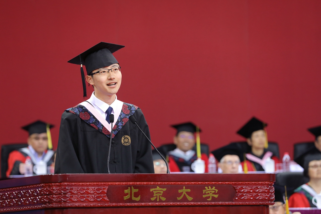 毕业生代表、元培学院2015级本科生张栋杰分享了从未名湖畔到天山脚下、从北大学生到乡村教师的心路历程。在青海格尔木参加爱心社的支教活动、在蔚秀园教老人使用智能手机、在国家会议中心做“一带一路峰会”志愿者……在校的四年间,志愿服务成为他生活中必不可少的一部分。如今,他作为北京大学研究生支教团的一员,即将赴新疆水西沟镇支教,去延续自己未竟的梦想。他说,北大赋予了自己尊严、学识和情怀,还有风雨中坚持奔跑的决心与力量,他愿以自己的微光照亮每一个孩子的内心,为教育扶贫贡献自己的绵薄之力。“远行的路上并不孤单,还有无数北大前辈与我们同向同行。”